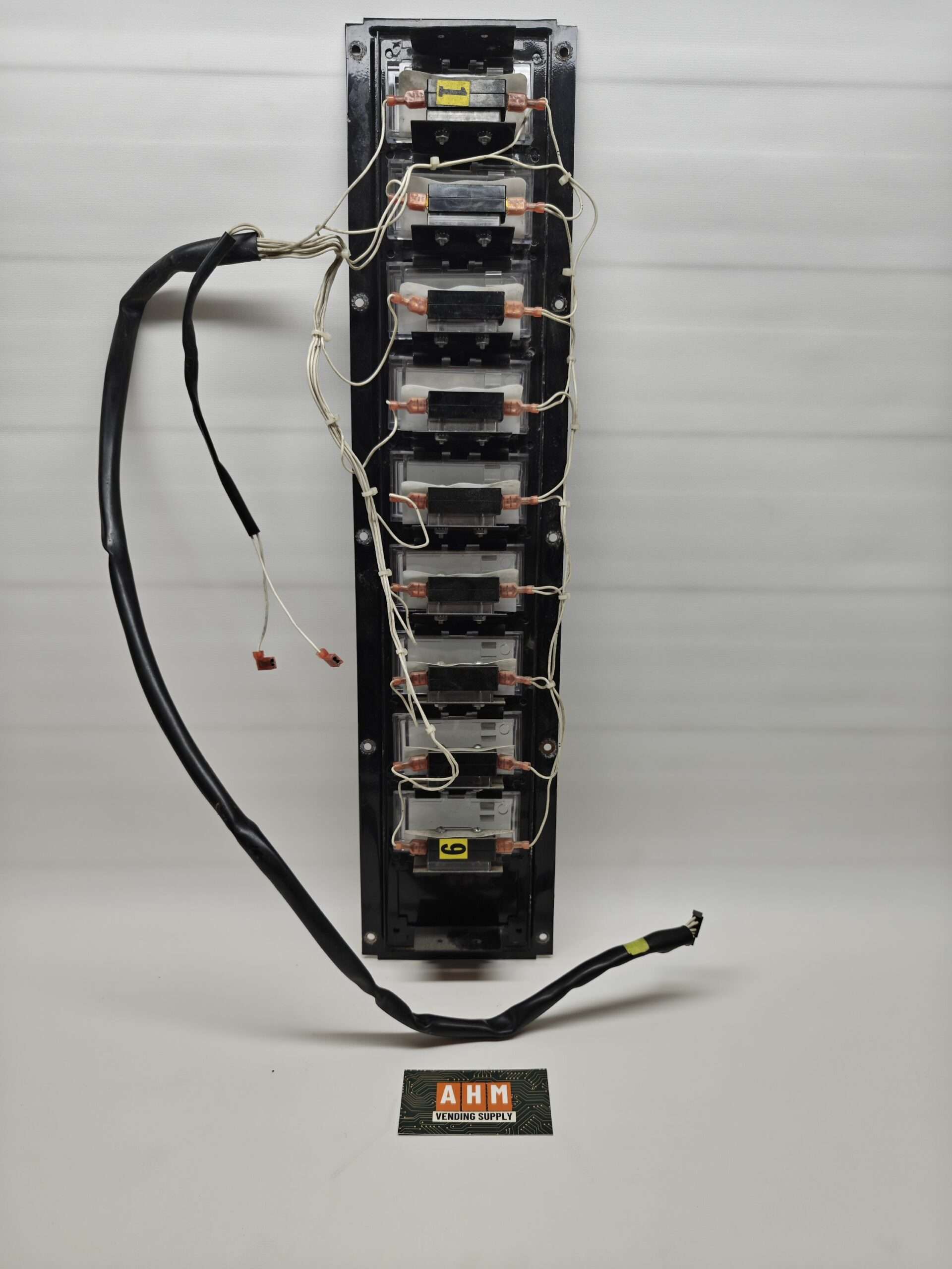 This is the nine-select button assembly used in various Dixie Narco soda vending machines. It includes the matching harness for easy installation and is a direct replacement for damaged or non-responsive selection panels.